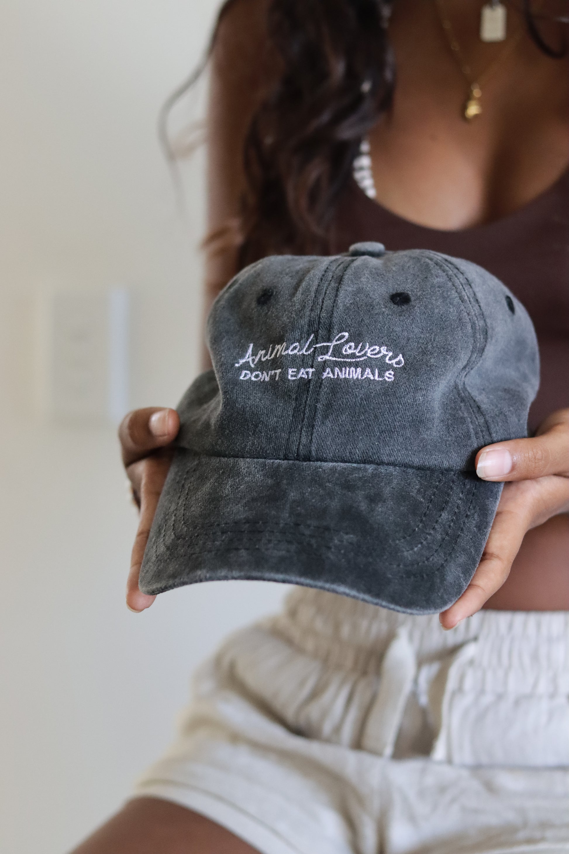 A cap with a backbone. This charcoal piece calls out the contradiction loud and clear...if you love animals, you don’t eat them. Strong embroidery, bold message, zero hesitation. Made for those who stand firmly on the side of compassion and aren’t afraid to challenge the norm. Wear it as a reminder, a statement, and a push for others to wake up.