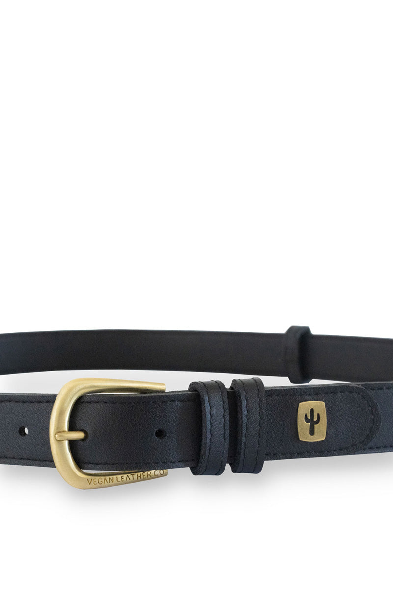 The Vegan Leather Co. Slim Cactus Belt is made with Organic Cactus Leather and features a handcast brass buckle.