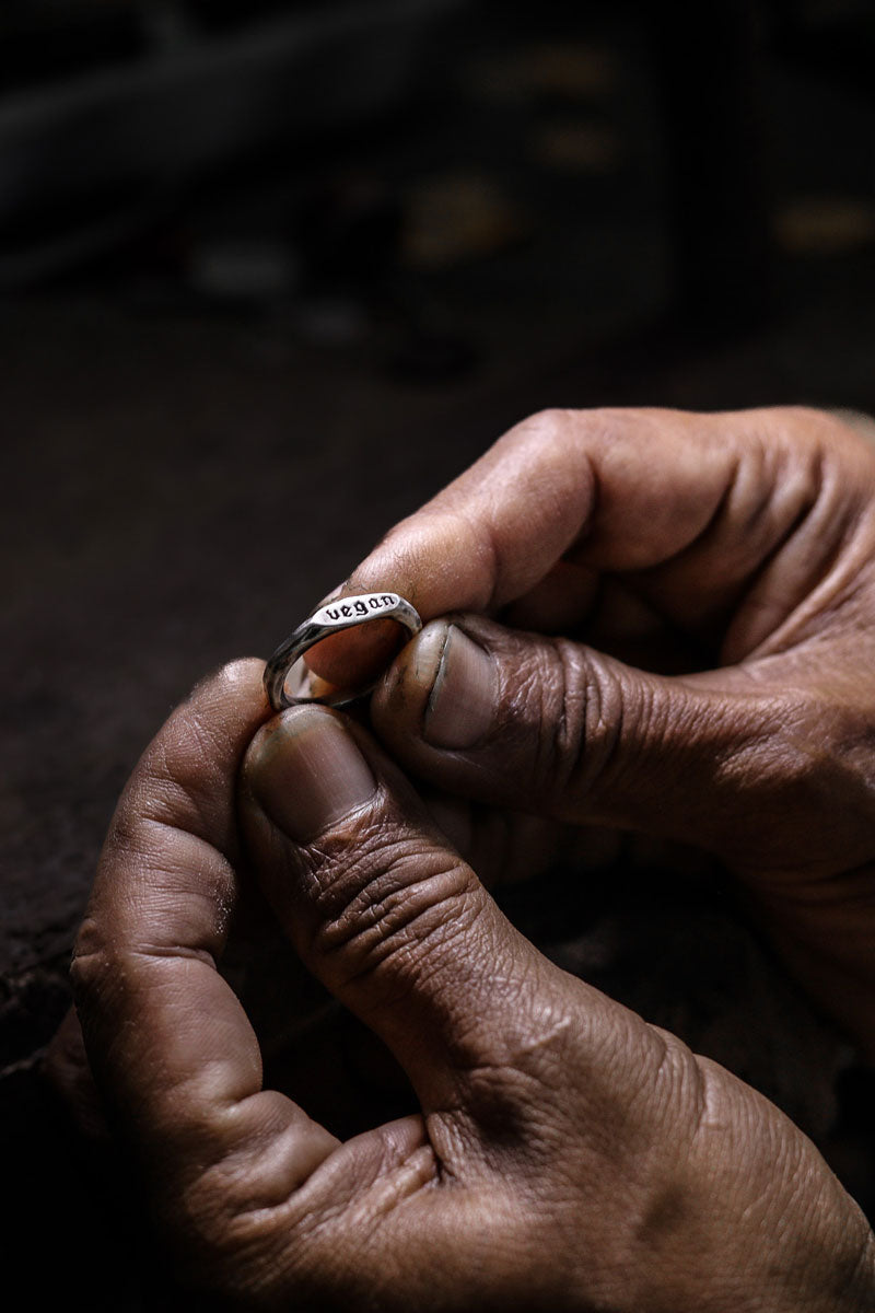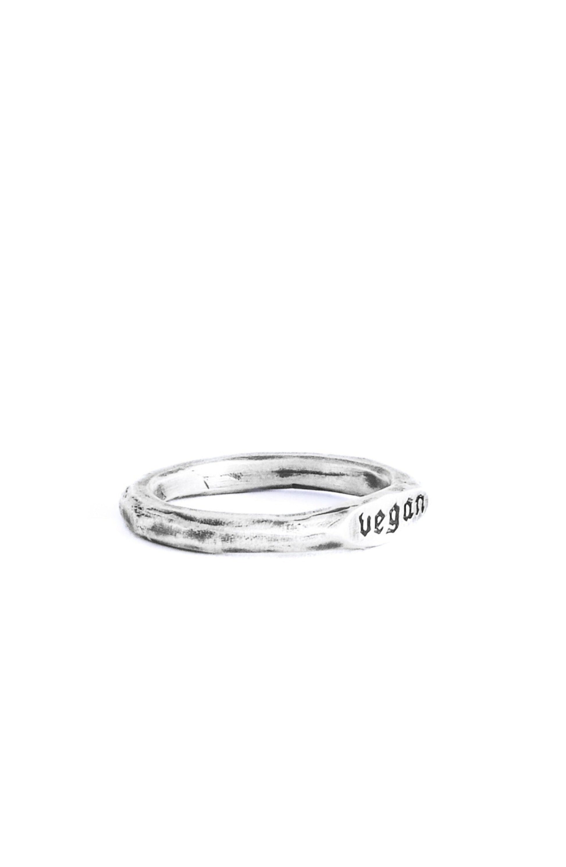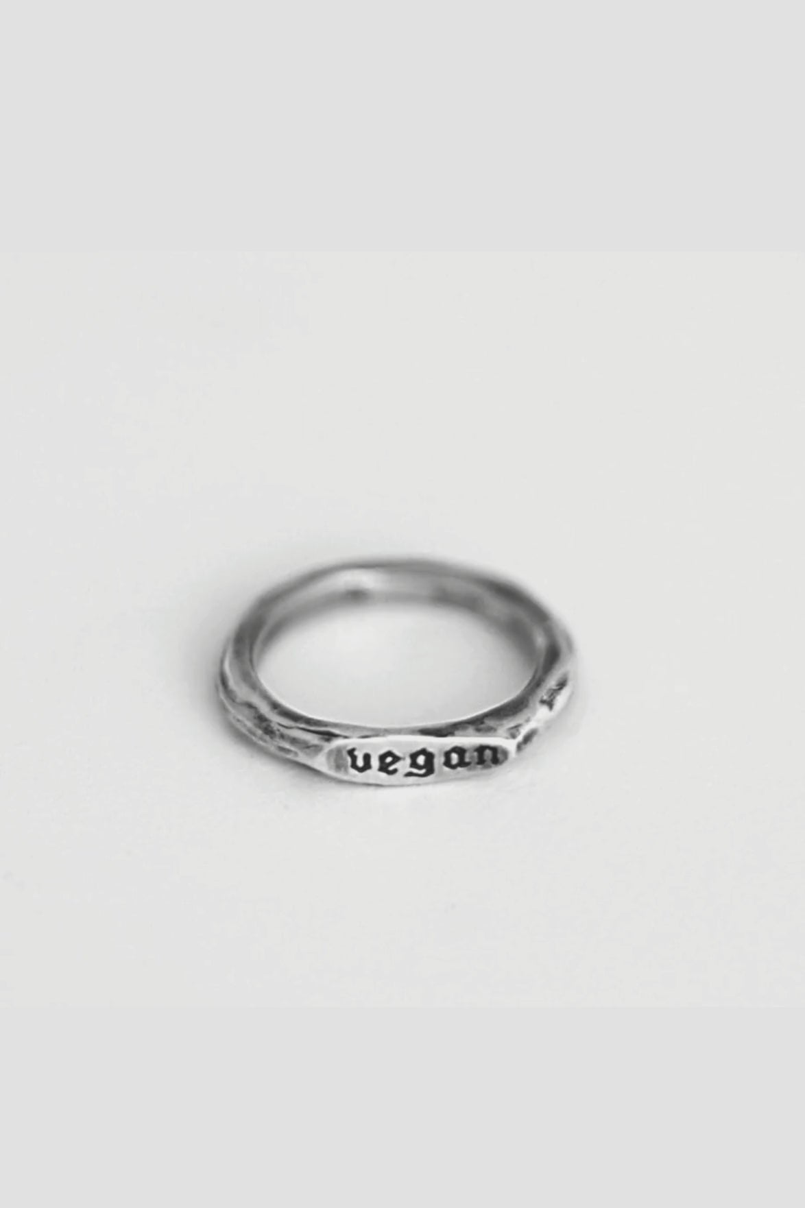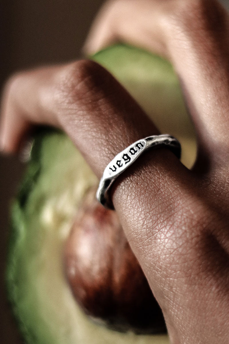 This ring features the word "vegan" boldly carved out, making a statement of your values.